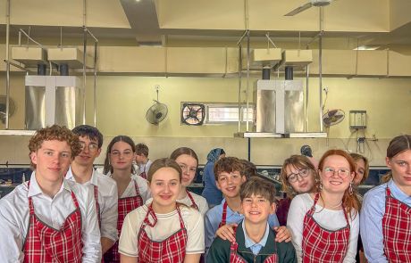 Danach mussten wir uns beeilen, um noch pünktlich zum Mittagessen zu kommen. Es gab Wraps, Sandwiches, Burger, Pommes und Salat. Zum Nachtisch gab es Schokokuchen mit Vanilleeis. Während des Essens bekamen wir die Fotos, die wir am Tag zuvor mit dem Schulleiter aufgenommen hatten.