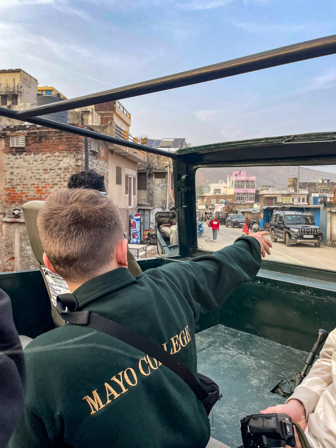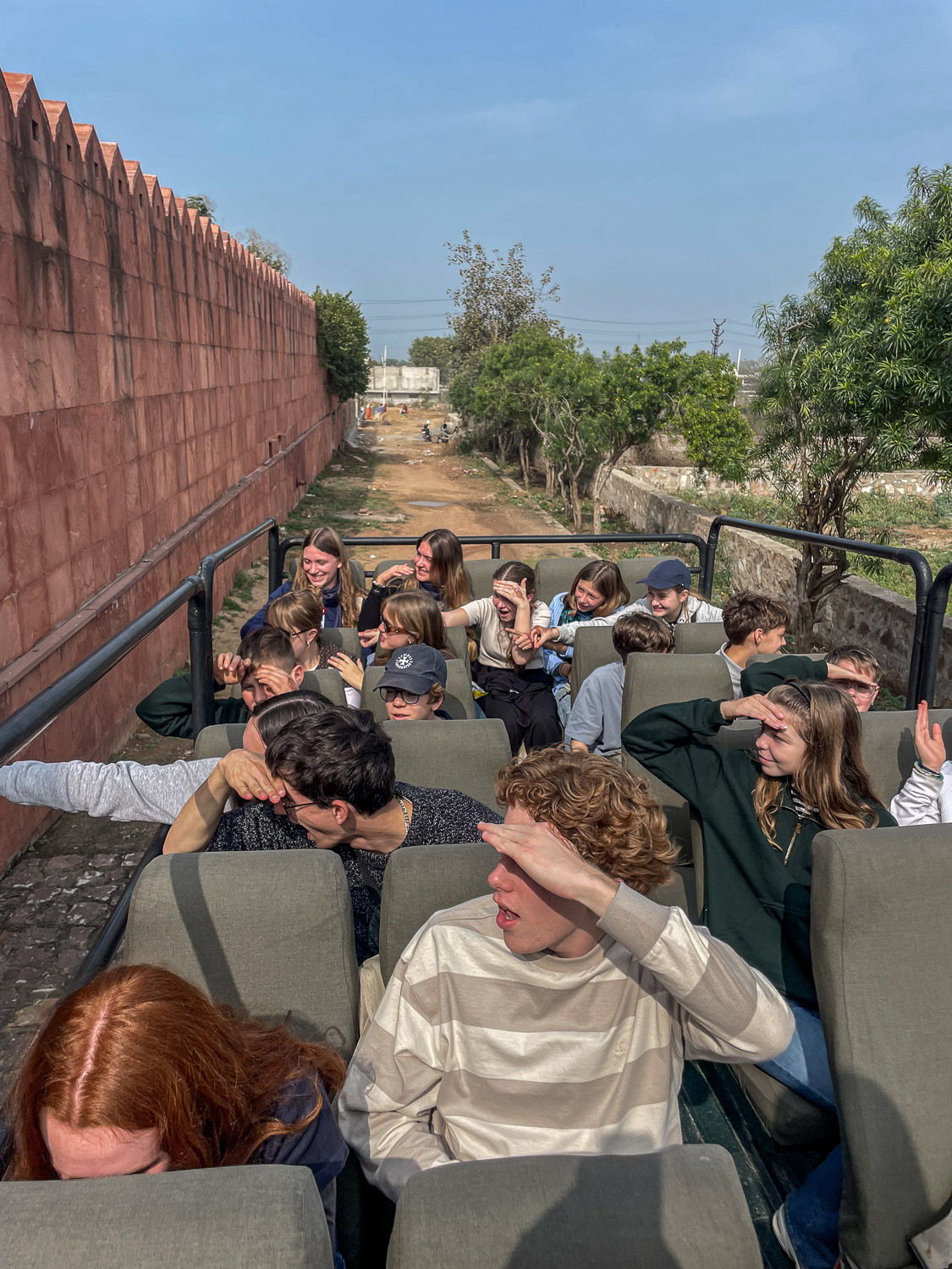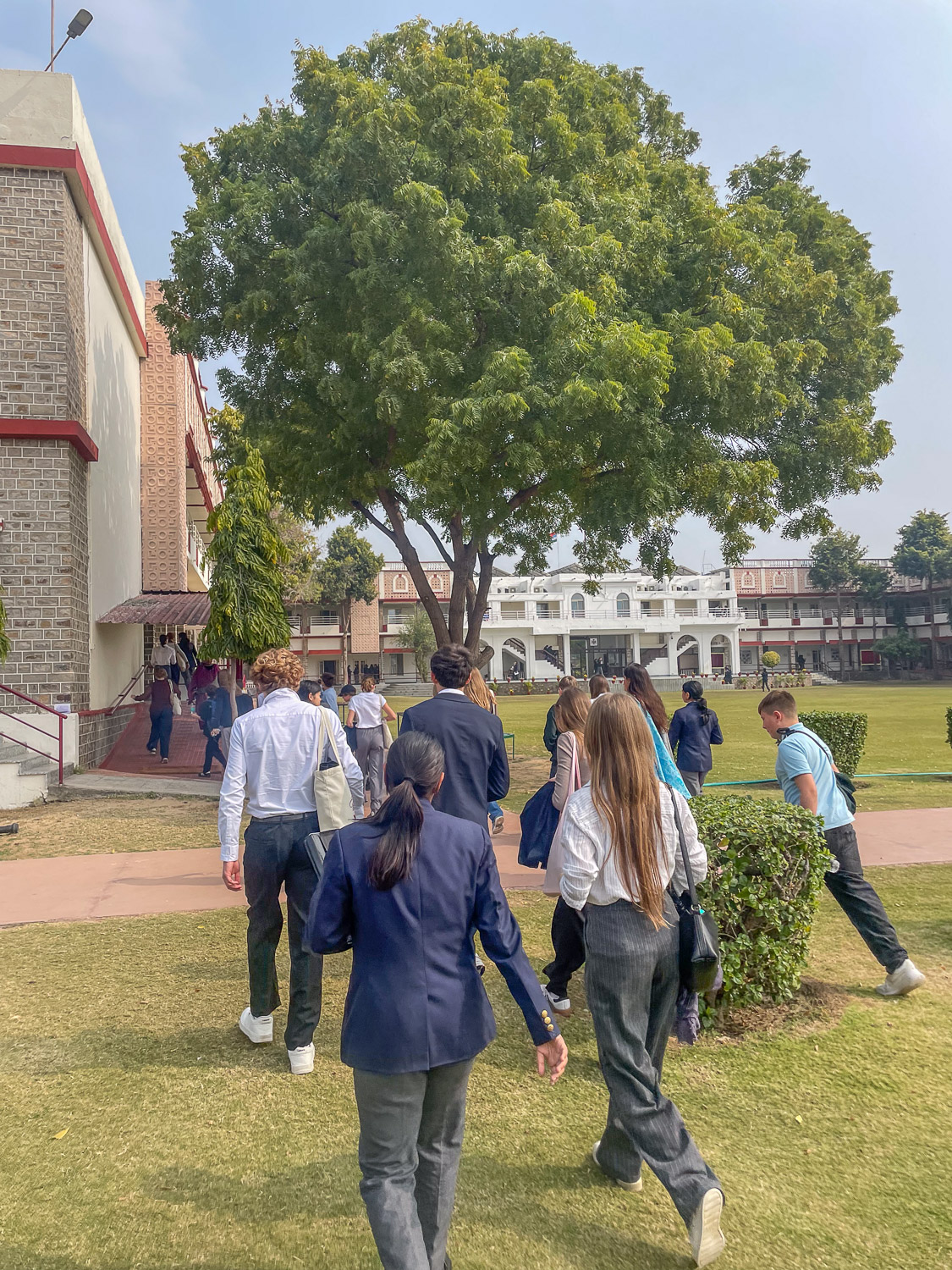 …unseren drei Lehrerinnen Frau Oberacker, Frau Reich und Frau Keller. Unsere Reise begann in Zürich, von wo aus wir mit dem A380 über Dubai nach Delhi flogen. Nach unserer Ankunft in Delhi wurden wir herzlich von Abhishek, einem Lehrer des Mayo College, empfangen und zu unserem Reisebus begleitet. Nach einer stärkenden Frühstückspause machten wir uns auf den Weg nach Ajmer. Die rund siebenstündige Busfahrt nutzten viele von uns, um etwas Schlaf nachzuholen.