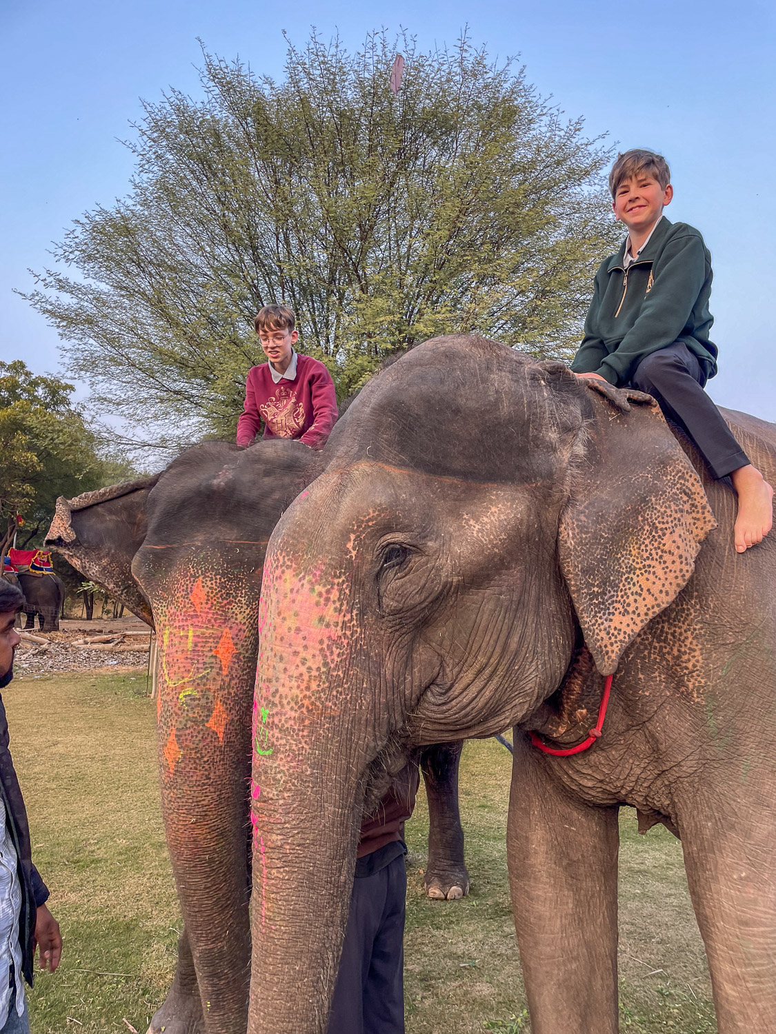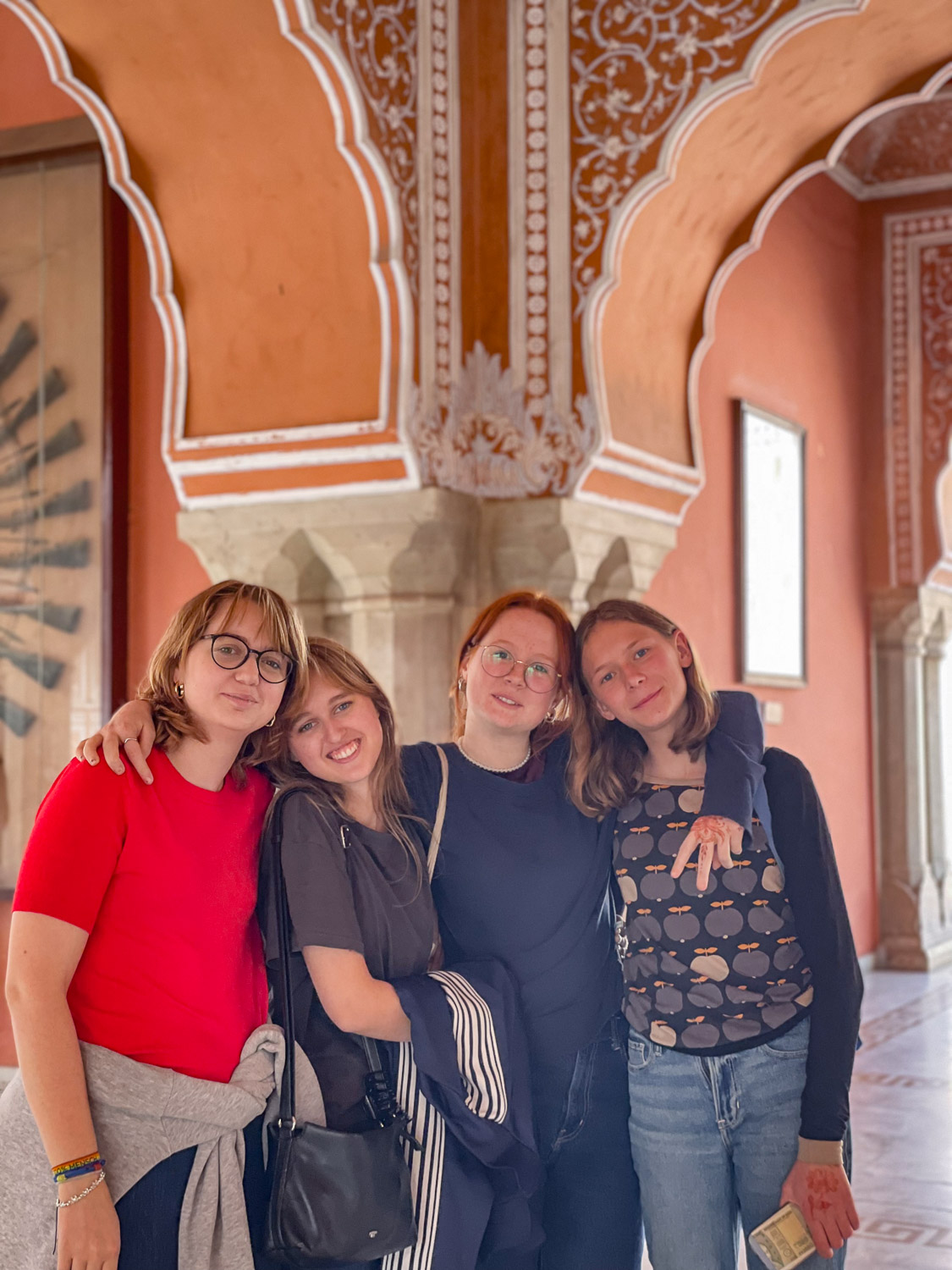 …haben wir den City Palace in Jaipur besichtigt, wo es viele tolle Gebäude gab und außerdem auch noch viele Ausstellungsstücke wie z.B. einen Thron, ein Zepter, und andere Utensilien. Danach sind wir mit dem Bus in die Nähe des Amber Palace gefahren, wo wir in Jeeps gestiegen sind. Die Jeepfahrt war super lustig, weil auf einmal eine Frau neben unserem Jeep stand und uns eine Art Glockenspiel verkaufen wollte. Die Jeeps haben uns dann den Berg hoch zum Palace gebracht, welcher auch als Festungsanlage benutzt wurde. Dort haben wir uns den Palast angeschaut. In dem Palast gab es ein kleines Fenster, durch das der Prinz das Treiben auf dem Palasthof beobachten konnte. Danach hat uns der Bus zu einem Elefant Village gebracht, wo wir zu allererst die Elefanten streicheln durften. Die Elefanten haben sich rau und warm angefühlt. Als nächstes durften alle die wollten auf die Elefanten klettern. Dazu musste man sich an den Ohren der Elefanten festhalten und sich mit einem Fuß auf den Rüssel des Elefanten stellen und danach hat der Elefant einen hochgehoben und man konnte sich in den Nacken des Elefanten setzen. Das hat allen superviel Spaß gemacht, aber Respekt vor den Elefanten hatte fast jeder. Zum Schluss durften alle die wollten noch eine kleine Runde auf Elefanten mit Sattel drehen. Die Elefanten wurden von Elefantenpflegern geritten.