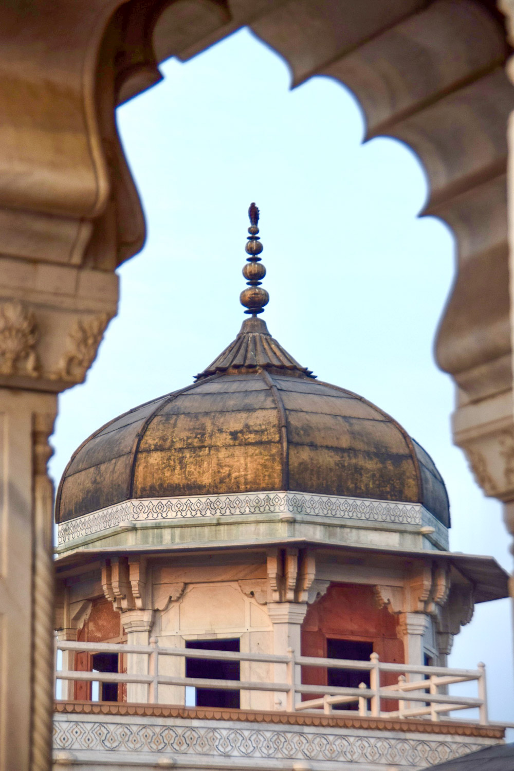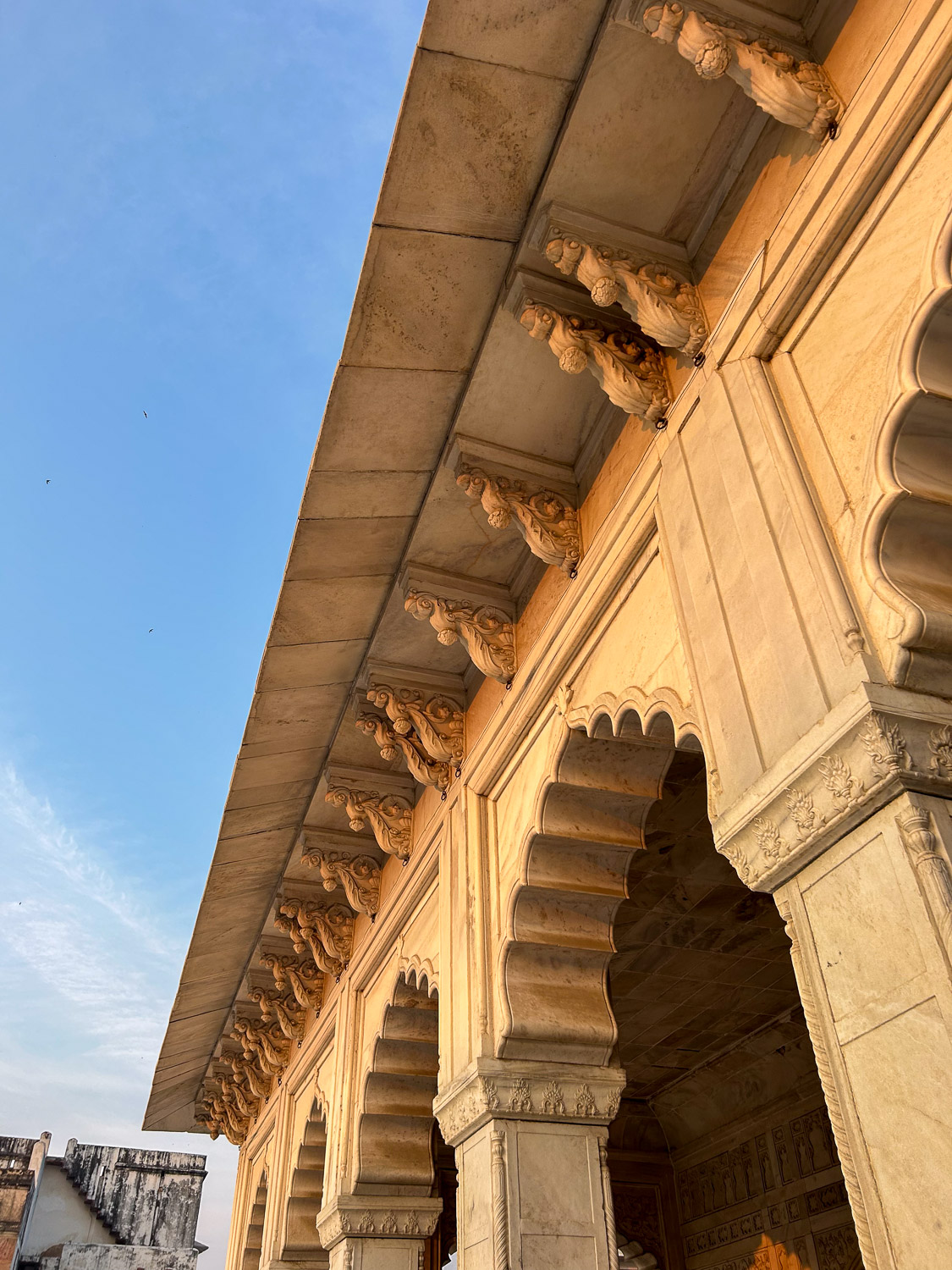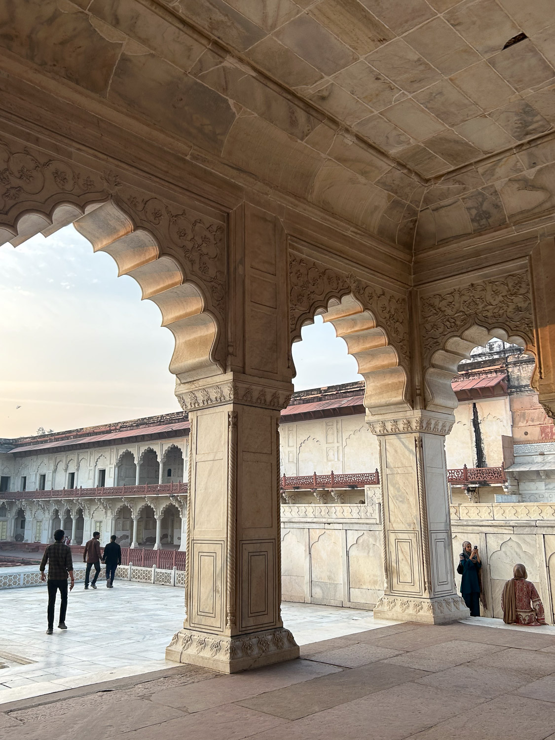 In Agra angekommen, besuchten wir das Agra Fort. Die beeindruckende Festungsanlage bietet einen Blick auf das Taj Mahal, den wir bei schöner Sonnenuntergangsstimmung genießen konnten. Es war wirklich faszinierend, durch eine optische Täuschung konnte man aus einer bestimmten Position das Taj Mahal wie durch ein Fernglas sehen. Das Taj Mahal bereits aus der Ferne zu sehen, steigerte unsere Vorfreude auf den Besuch am nächsten Morgen.