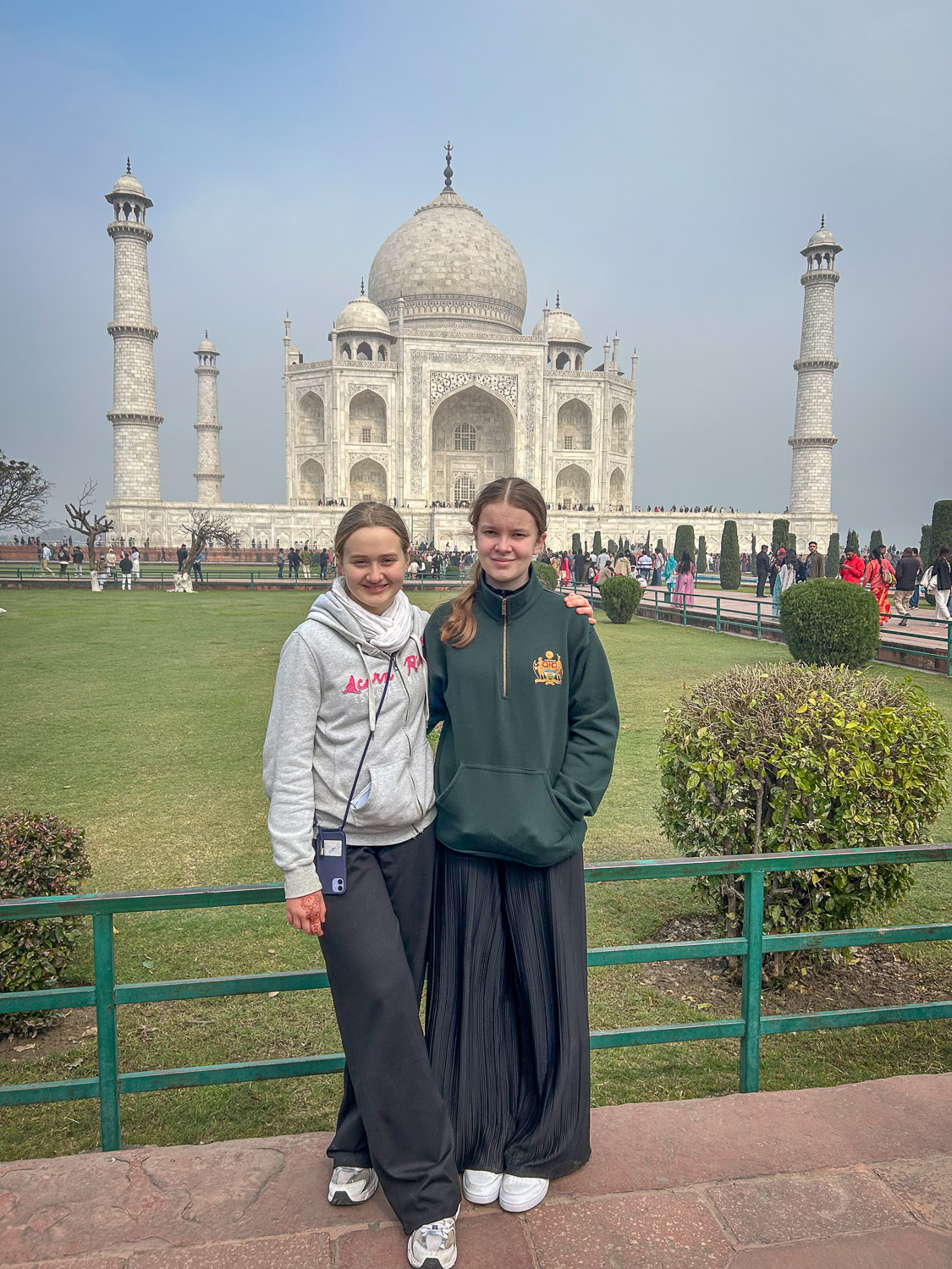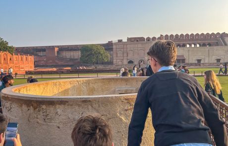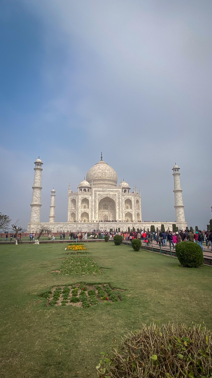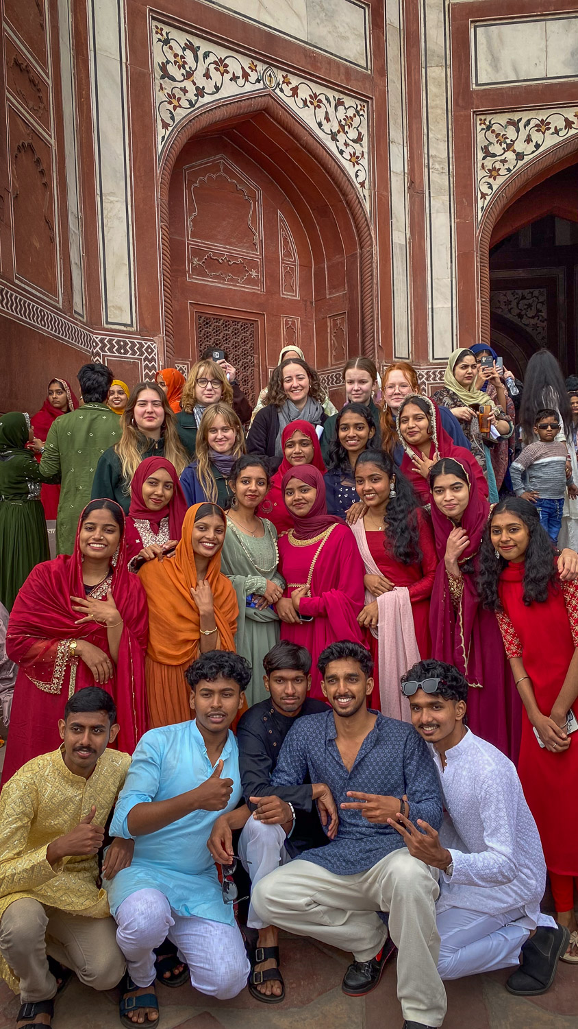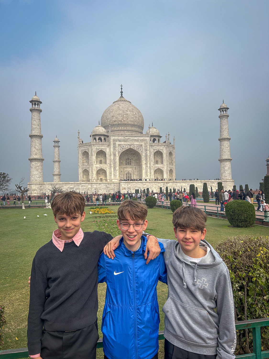 …erst gegen 12 Uhr hinzugehen. Somit konnten wir immerhin länger schlafen, was alle sehr gefreut hat. Beim Taj Mahal machten wir viele Fotos und bewunderten das schöne Gebäude von außen und auch kurz von innen. Ein Guide erzählte uns außerdem viele spannende Dinge über das Taj Mahal, wie zum Beispiel, dass der Eingang mit Schriftzeichen aus dem Koran geschmückt ist.